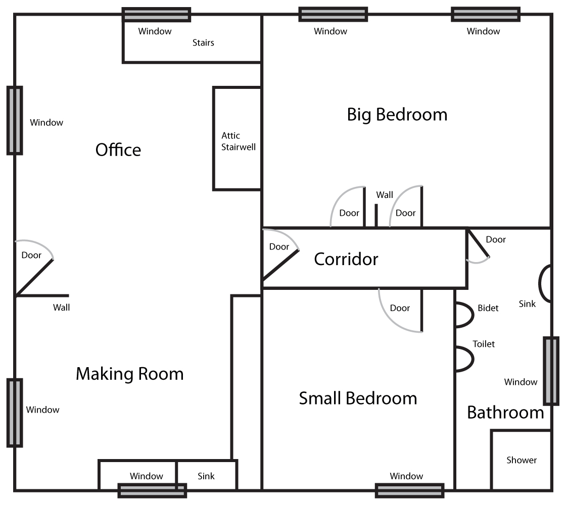 The Office contains the staircase leading up to the full-size attic, as well as a second staircase going down to the living room. This was originally a traditional farmhouse, with the second floor as the main living area and the ground floor used for storage and other purposes.